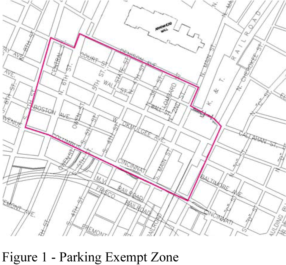 Parking Exempt Zone: beginning at the intersection of 7th Street with Court Street then east along Court Street to 6th Street, then north along 6th Street to Denison Street, then east along Denison Street to Main Street, then south along Main Street to Court Street, then east along Court Street to Cherokee Street, then south along Cherokee street to Columbus Street, then west along Columbus Street to 7th Street, then north along 7th Street to the point of beginning (see figure 1).
