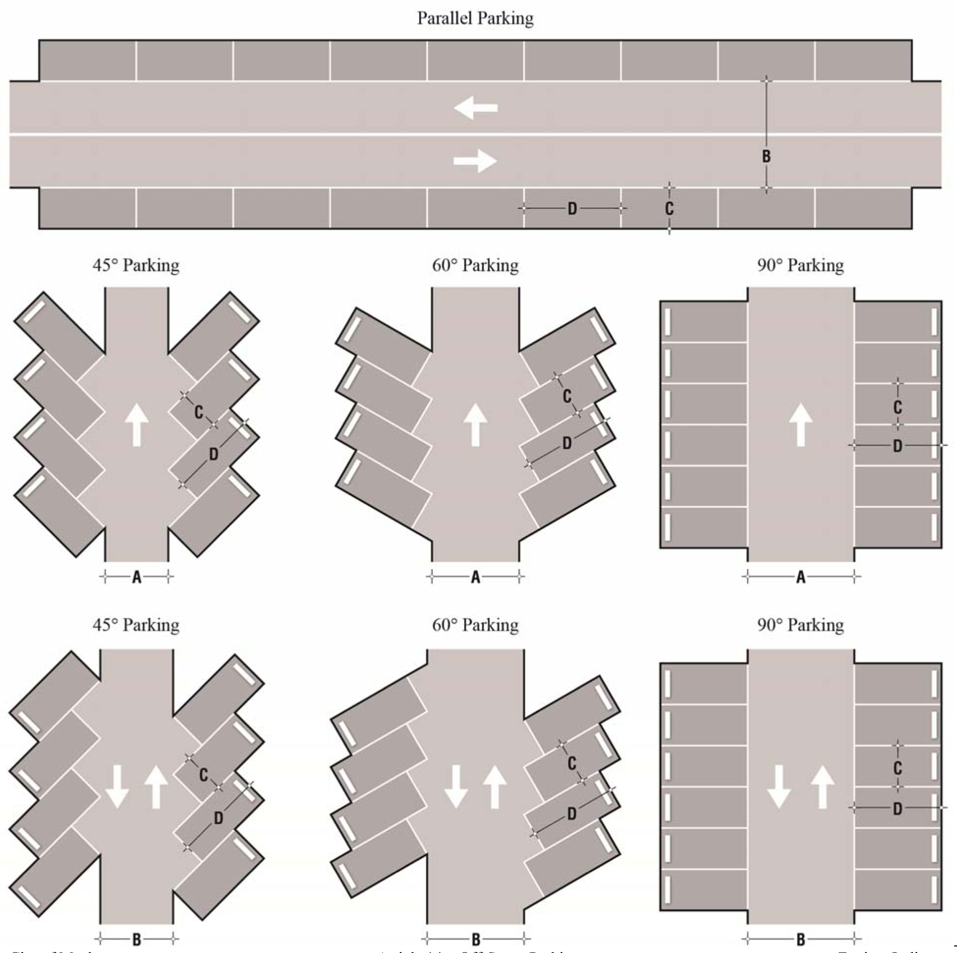 Within off-street parking lots, one-way traffic aisles shall be at least eleven (11) feet in width and two-way traffic aisles shall be at least twenty (20) feet in width. Furthermore, all aisles shall be provided as shown in the figure 90-14-09.A Parking Dimensions by Angle.