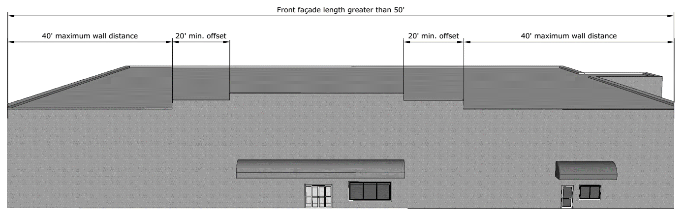 10.93.3.5. Buildings Adjacent to Street Frontage. Building walls adjacent to a street frontage shall include foundation landscaping directly adjacent to the building to screen any crawl space, stem wall, lattice work, or open parking areas.
