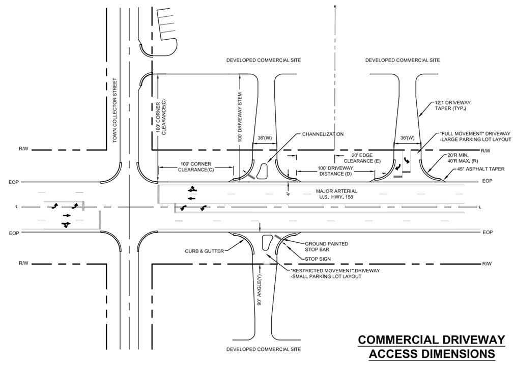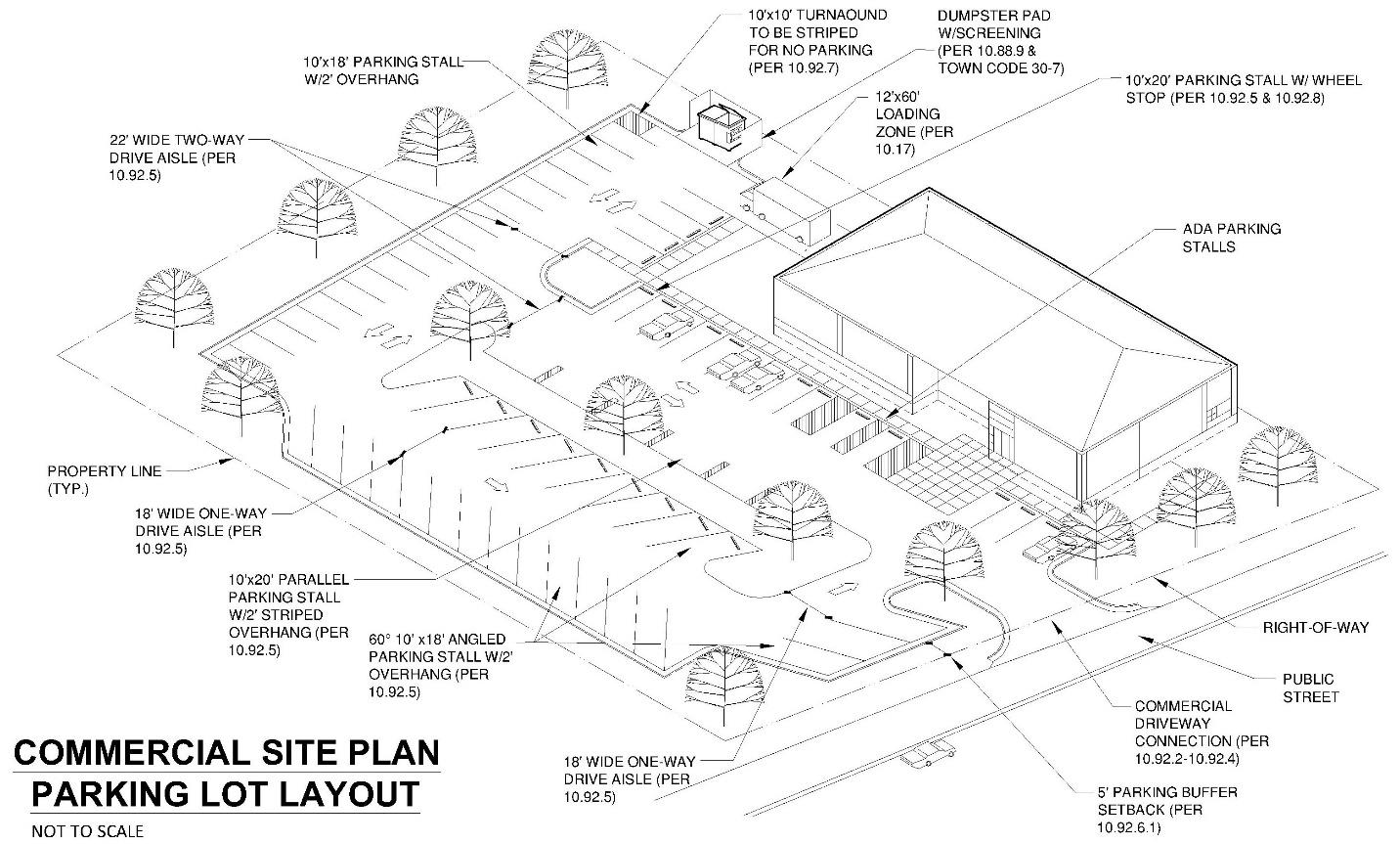 10.13.2. Design standards for parking lots, including driveway design, access to Town and State roads, parking stall dimensions, fire lanes, and site design and parking lot orientation are included in the Commercial Design Standards section of this UDO (Article 10, Part VI).