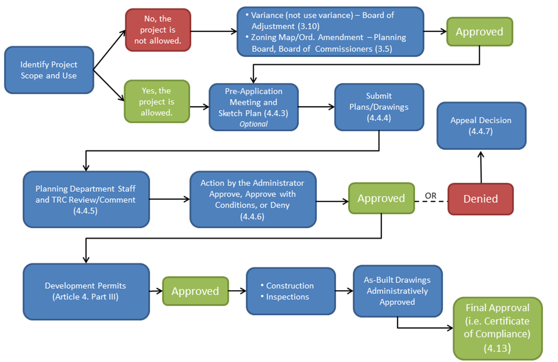 The formal development review process is designed for non-residential development (i.e., projects other than one- and two-family dwellings) applications that require review by the Planning Board and Board of Commissioners. The permitting process for one- and two-family dwellings is provided in Part III, Development Permitting Requirements.