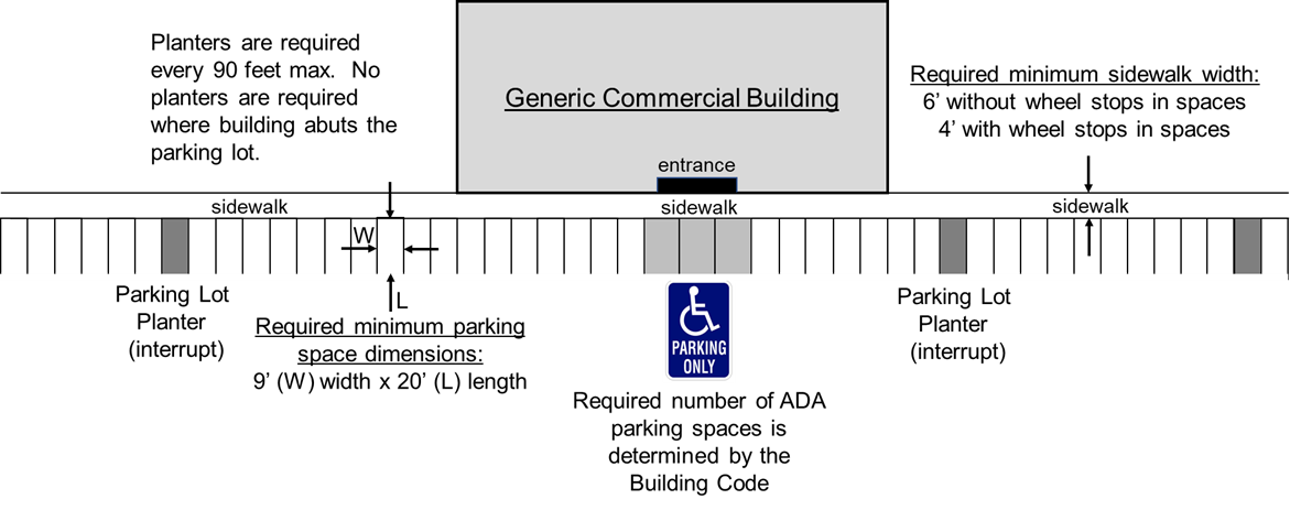 If a parking bank that abuts the front entry area of such a building extends past the outside walls of the building, then planters shall be required where any continuous 90-foot parking space intervals are found past the building walls. Refer to the following illustration:
