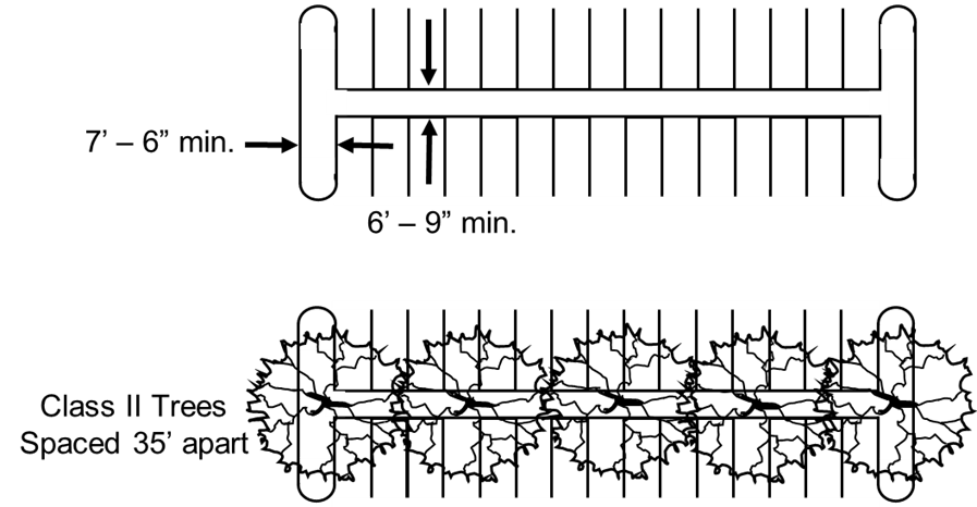 Where two parking rows adjoin each other "head to head," back to back planters may be situated, or they may be separated. If placed back to back in, for example, a pair of 90 degree oriented parking rows, then the resulting planters would likely appear to be a single nine foot wide by 40-foot deep/long planter.