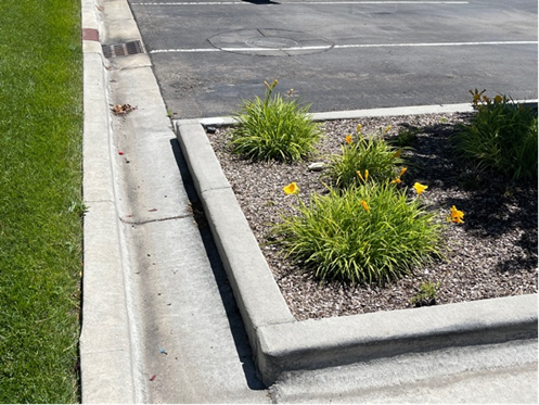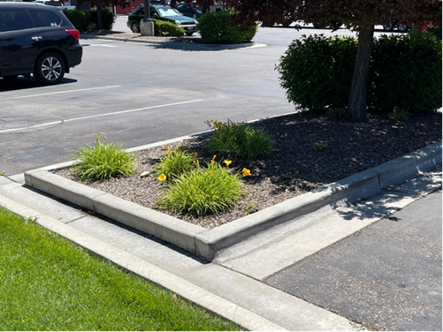 Drainage channel. A one foot cutout (preferred) or six- to eight-foot culvert pipe (less preferred) may be used at the end of or within a parking planter's abutment against a curb or other barrier in order to facilitate site drainage (e.g., stormwater flow across a parking lot into a drain). (See examples below.)