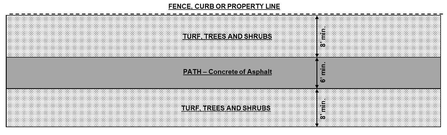 Walking path. For every 200 dwelling units: One mile of six-foot wide paved looped walking trail with eight-foot shoulders of turf, trees and shrubs, seating every 1,000 feet, and one and a quarter mile markers is required. Trees shall be one and a half inch-caliper at one foot above the root ball class I or class II deciduous variety, or six feet minimum height evergreen trees (no more than 25 percent of the total trees utilized may be evergreen trees). The total number of trees required shall be one tree for every 50 linear feet of trail. Trees and shrubs may be linear or grouped in clusters that are evenly distributed along the trail corridor, or some combination thereof (see below). Exceptions to the width of the eight-foot shoulders and the tree planting requirements may be granted by the commission as part of the conceptual plan approval process.