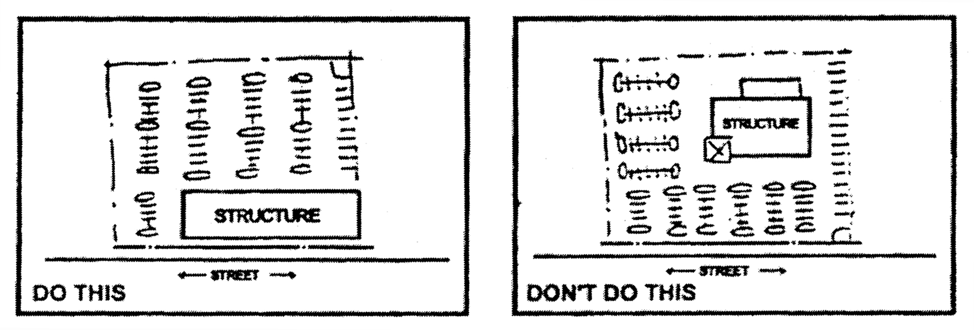 6 spaces maximum between landscape islands; minimum 8-foot-wide island, 16-foot island at ends of block; minimum 4-foot strip of landscape in front of cars, if possible; best engineering practices.