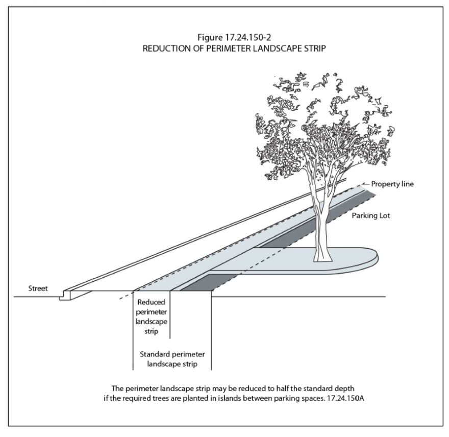 Perimeter landscape strips adjacent to public streets with less than four travel lanes (as classified by the major street plan) shall be a minimum of five feet in width, unless: (a) the strip includes a permanent finished wall no less than thirty inches in height; or (b) the required trees are planted in islands between the parking spaces. In such cases the perimeter landscape strip may be reduced to two and one-half feet in width. (See Figure 17.24.150-2)