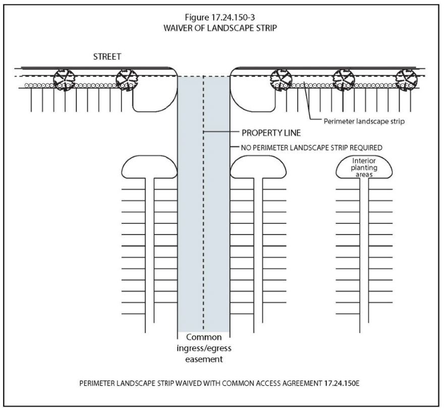 Adjacent Parking Areas with Shared Access. Parking areas on adjacent properties, which are designed to share a common access from the public right-of-way and a vehicular travelway along their common property line shall be exempt from the requirement for a parking area perimeter landscape strip along their common property line, upon the recording of an easement agreement which provides for the mutual right of ingress and egress for both property owners. (See Figure 17.24.150-3)