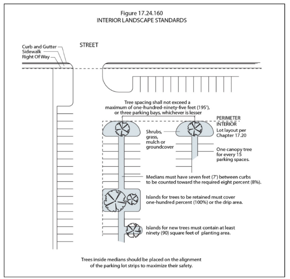 Outside the urban zoning overlay district, and for parking lots containing thirty or more parking spaces within the urban zoning overlay district, a minimum of ninety square feet of planting area shall be required for each new canopy tree (See Figure 17.24.160), and a minimum planting area of one hundred percent of the drip line area of the tree shall be required for all existing trees to remain. If the applicant can demonstrate that conditions allow that the tree will be preserved with an area less than one hundred percent, lesser area may be approved by the urban forester. (See Figure 17.24.160)