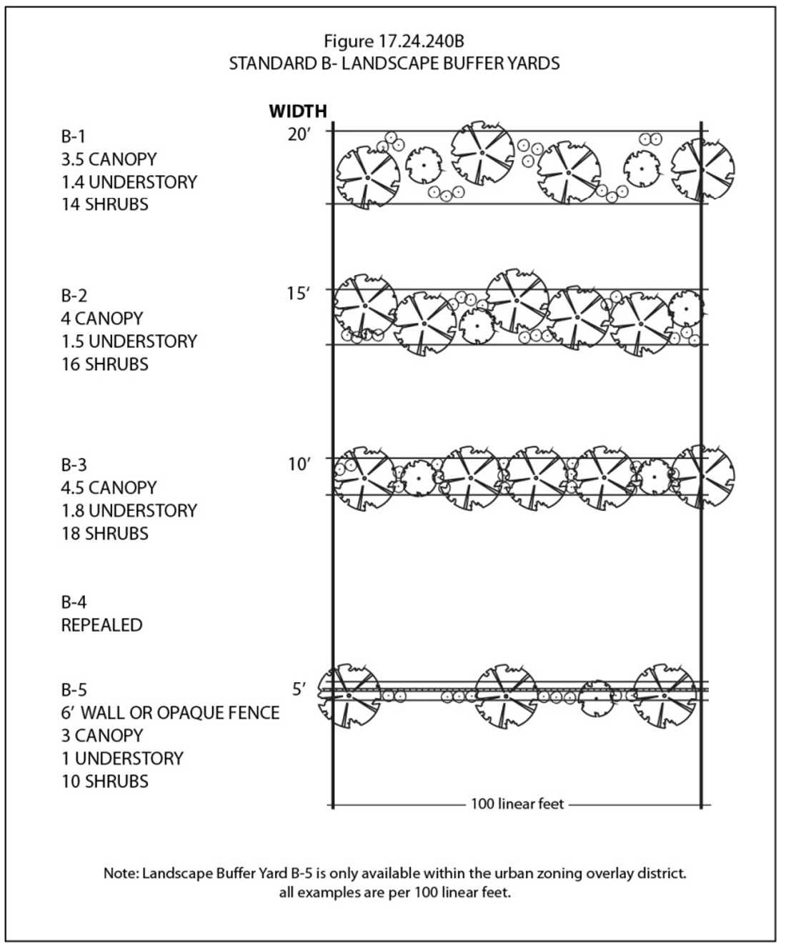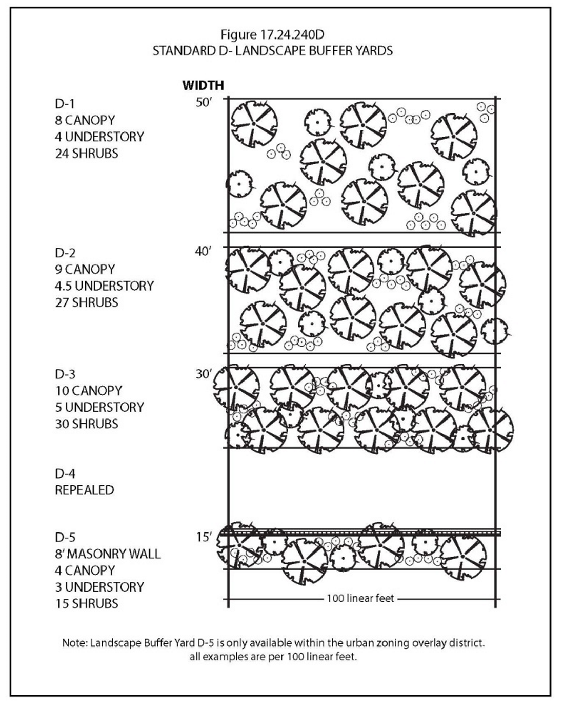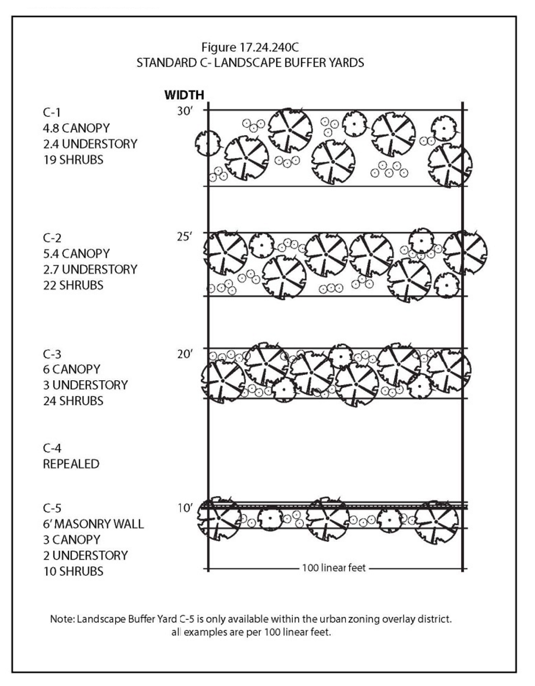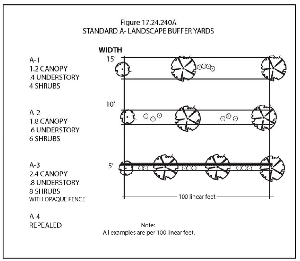 Application of Landscape Buffer Yard Standards. The specifications contained in Figures 17.24.240A through 17.24.240D, set out at the end of this chapter, shall be used to select the desired landscape buffer yard option for the building site. These yard requirements are stated in terms of minimum yard width and the density of required plant material per linear foot of yard. To determine the total number of plants required, the length of each side of property requiring a landscape buffer yard shall be divided by one hundred and multiplied by the number of plants shown in the illustration.