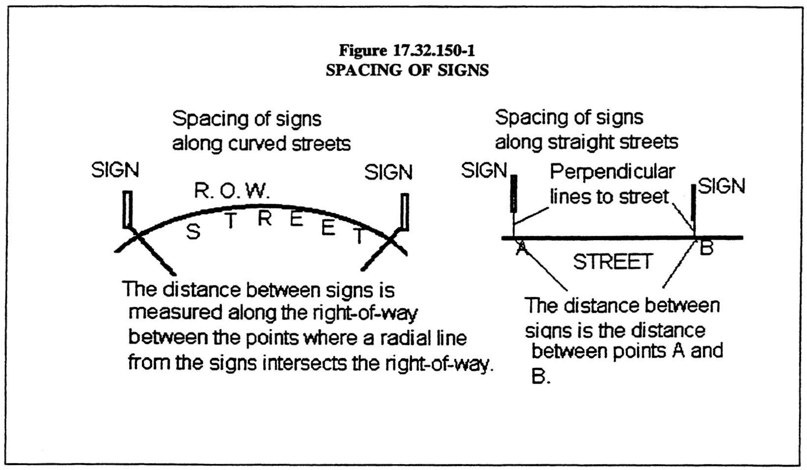 The spacing requirements shall be applied separately to each side of a public street, but continuously along the side of a street to all signs oriented toward that street in either direction whether the signs are in the same block or are in different blocks separated by an intersecting side street. (See Figure 17.32.150-1)