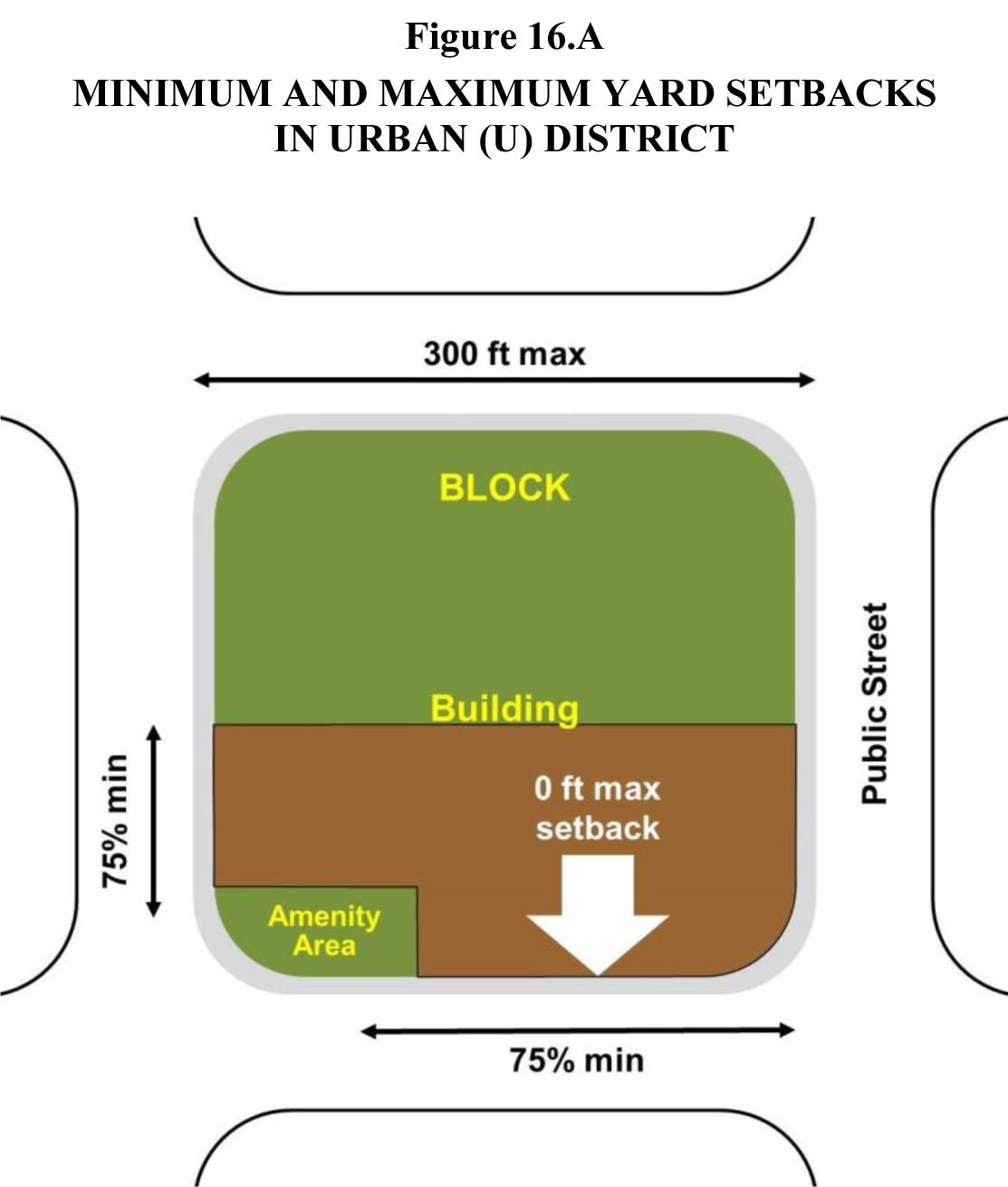 In the U district, for each yard that fronts on a public street or other public right-of-way reserved for non-vehicular circulation, at least seventy-five (75) percent of the façade of a principal building shall be at the property line, with zero feet of setback, as illustrated in Figure 16.A. Where portions of a principal building are set back, the yard area between the building façade and the property line may be used only for landscaped open space and/or streetscape enhancements (e.g., water feature, public art installation) or to accommodate a public plaza or pocket park or an outdoor seating area associated with a restaurant, bar or hotel. Additionally, the seventy-five (75) percent minimum requirement may be decreased if the additional yard area between the building façade and the property line is also used for the amenities cited above.