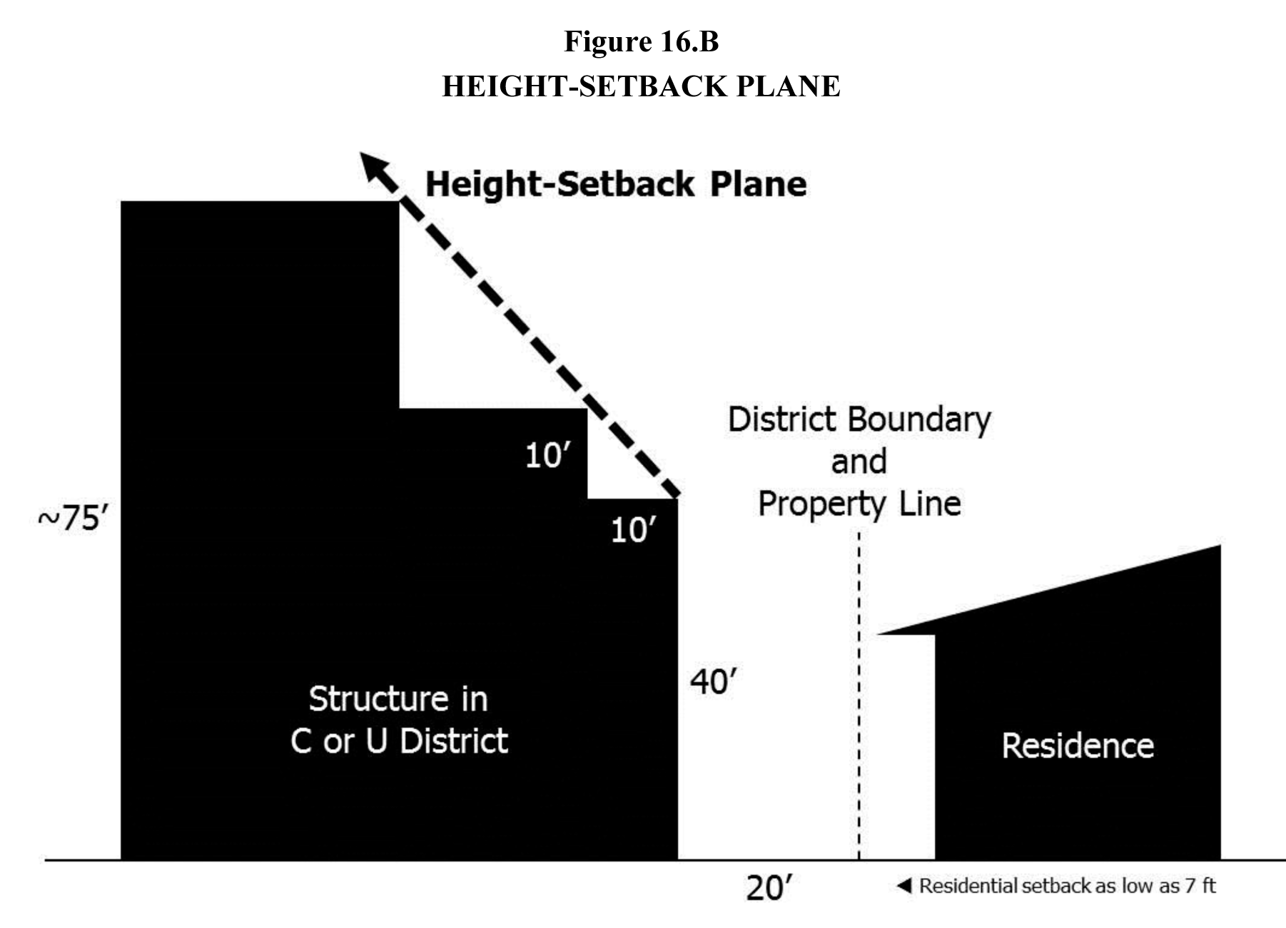 In the C and U districts, where a property is at an edge of the district and abuts property outside the district that is in entirely residential use or in a residential zoning district, the minimum yard setback toward the abutting property shall be twenty (20) feet. Additionally, any portion of the principal building that exceeds forty (40) feet in height shall be set back an additional amount, computed as one foot from the 20-foot building line at ground level for each one foot of additional building height above forty (40) feet. This ratio establishes a height-setback plane as illustrated in Figure 16.B.