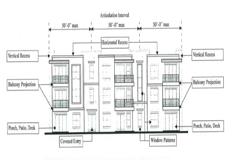 Architectural enhancements. Facade articulation shall be required to add architectural interest and variety to the massing of a building to prevent monotonous facades. A variety of features shall be incorporated into the design of the buildings to provide sufficient articulation of the facades. This shall be achieved by incorporating the use of vertical or horizontal reveals, stepbacks, modulation, projections, roof detailing, and three-dimensional details between surface planes to create shadow lines and break up flat surface areas. For buildings over three (3) stories, over five thousand (5,000) square feet in gross building footprint or with façades longer than one hundred (100) feet, facades shall comply with an articulation interval established in this section. The "articulation interval" at which the repetitive architectural enhancements repeat should not be greater than fifty (50) feet in length measured horizontally as shown in Figure 45-52. This interval may be adjusted by the Planning Director as needed to comply with additional design standards. A minimum of four (4) of the following architectural enhancements or other similar treatments shall be integrated into building facades which front sidewalks and streets: