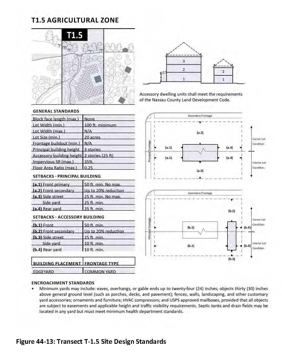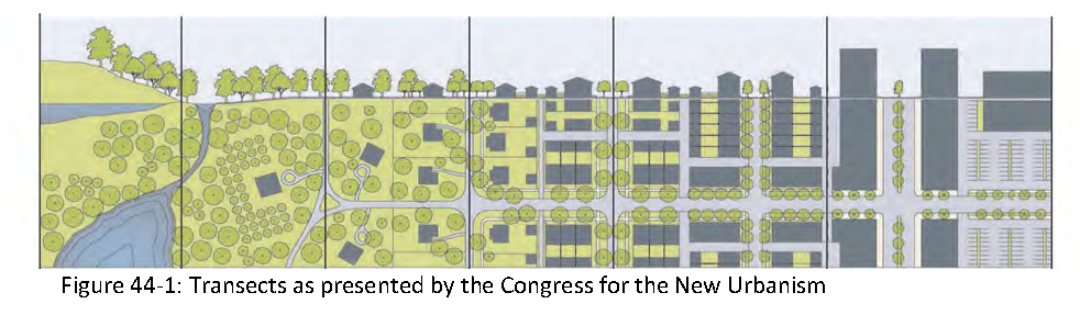 The TBZ framework organizes development through a series of transects that represent a continuum from natural, preserved areas to the urban core. This system allows for the gradual transition from rural to urban character, ensuring that development intensity and form are responsive to context. In addition to the primary transect zones (ranging from natural to urban core), a special district classification is provided to accommodate development types that do not fit within the primary transects. Figure 44-1 illustrates the transect framework as defined by the Congress for the New Urbanism. A detailed description of Nassau County's transects is provided in section 44.04.