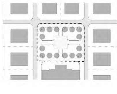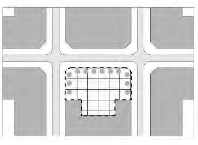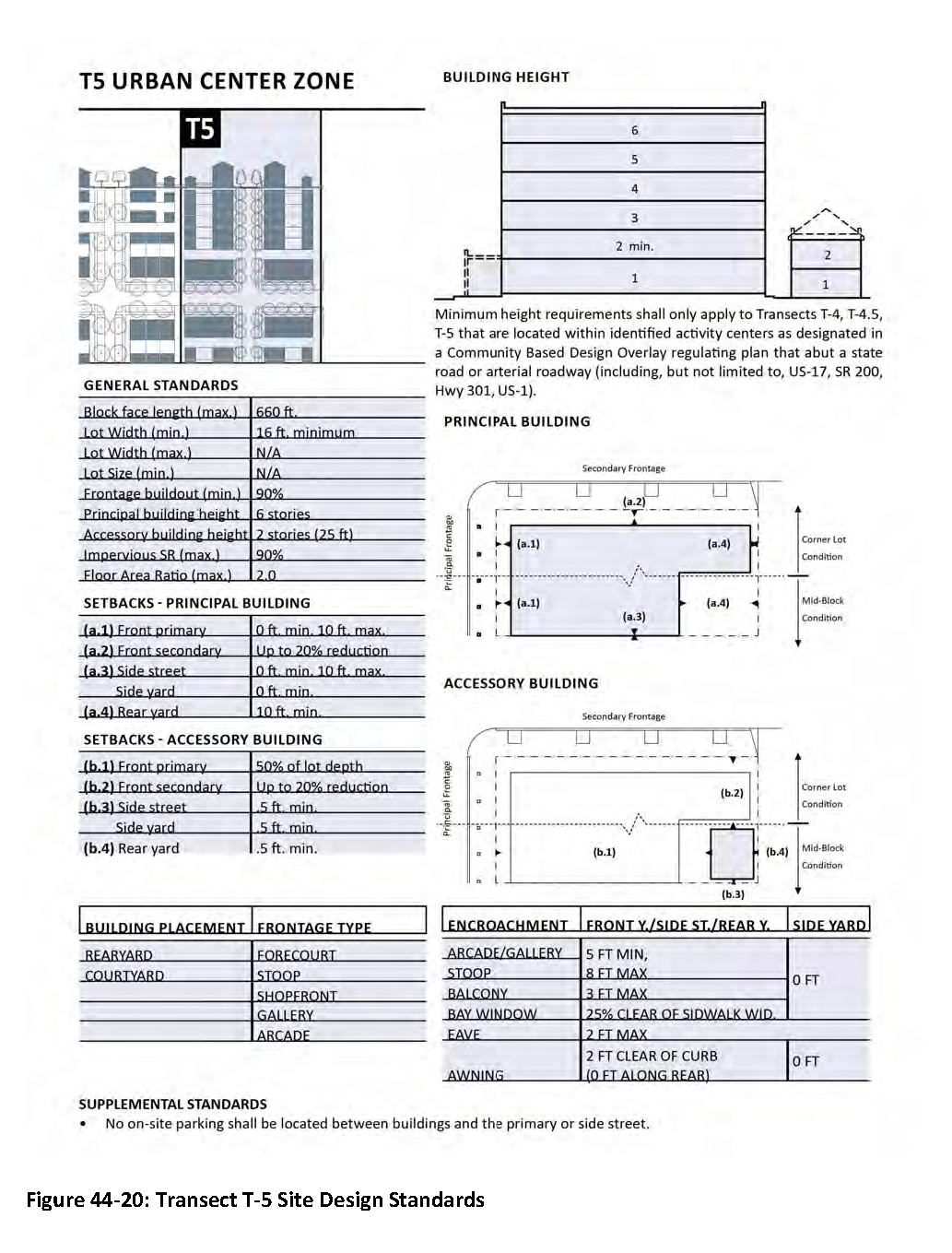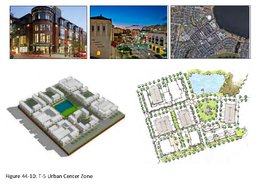 T-5 Urban Center Zone. This transect consists of higher-density, mixed-use buildings that accommodate retail, office, civic, and residential uses. It has a tight network of streets with wide sidewalks, interval street tree planting and buildings placed close to the sidewalks. It has shallow to no setbacks and building heights can reach up to six (6) stories. The residential density range is ten (10) to twenty-five (25) dwelling units per acre. The first floor of all buildings engages the public realm, primarily with the use of storefront windows.