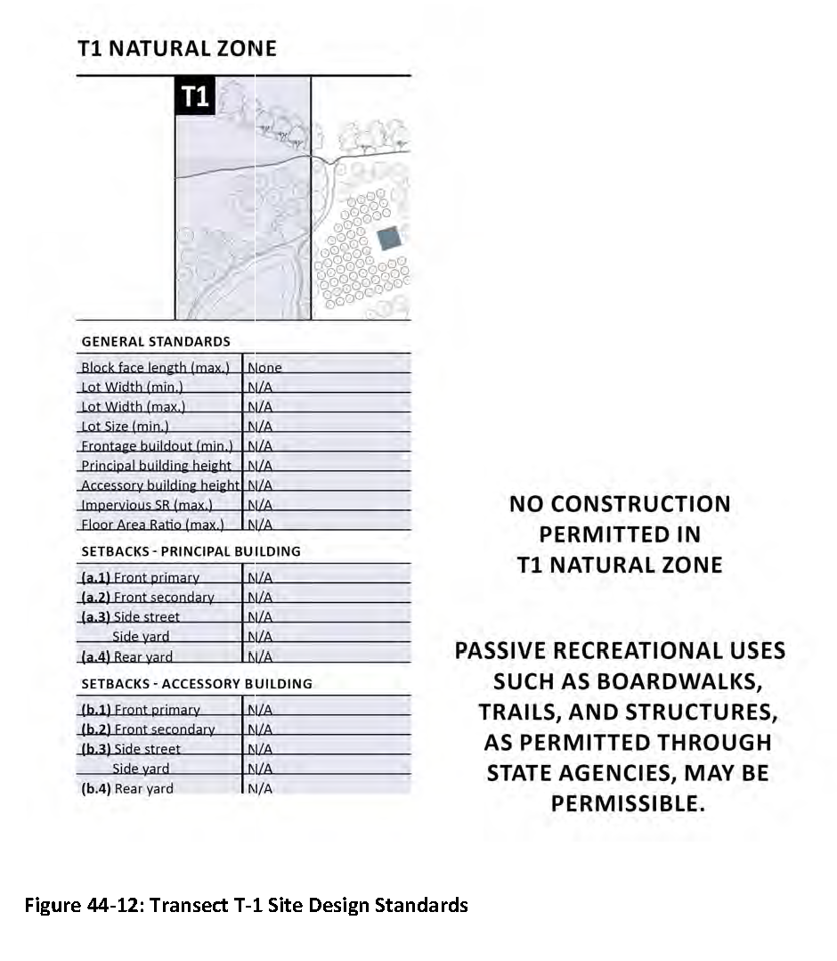 Due to environmental constraints, development is prohibited within the T-1 transect, except for water-dependent recreational uses, including boat/kayak ramps, launches, and passive recreational features such as elevated boardwalks, riverfront promenades, and viewing platforms.