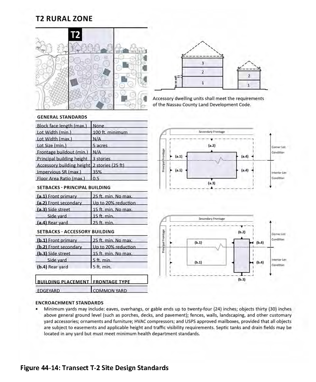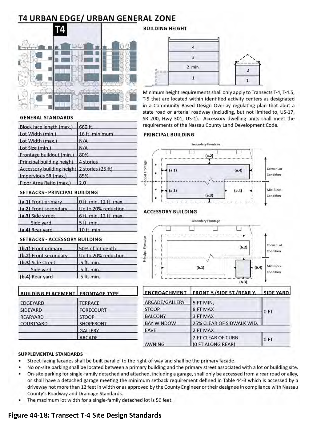 The transect system of spatial and land use organization, also commonly referred to as form-based districts, establishes a framework where land uses, building design, density, height, street design, open space, parking, and other elements of the built environment are comprehensively coordinated. Nassau County recognizes and adopts the following transects, each of which serves a distinct role in guiding the development pattern, transition, and character of the built environment.
