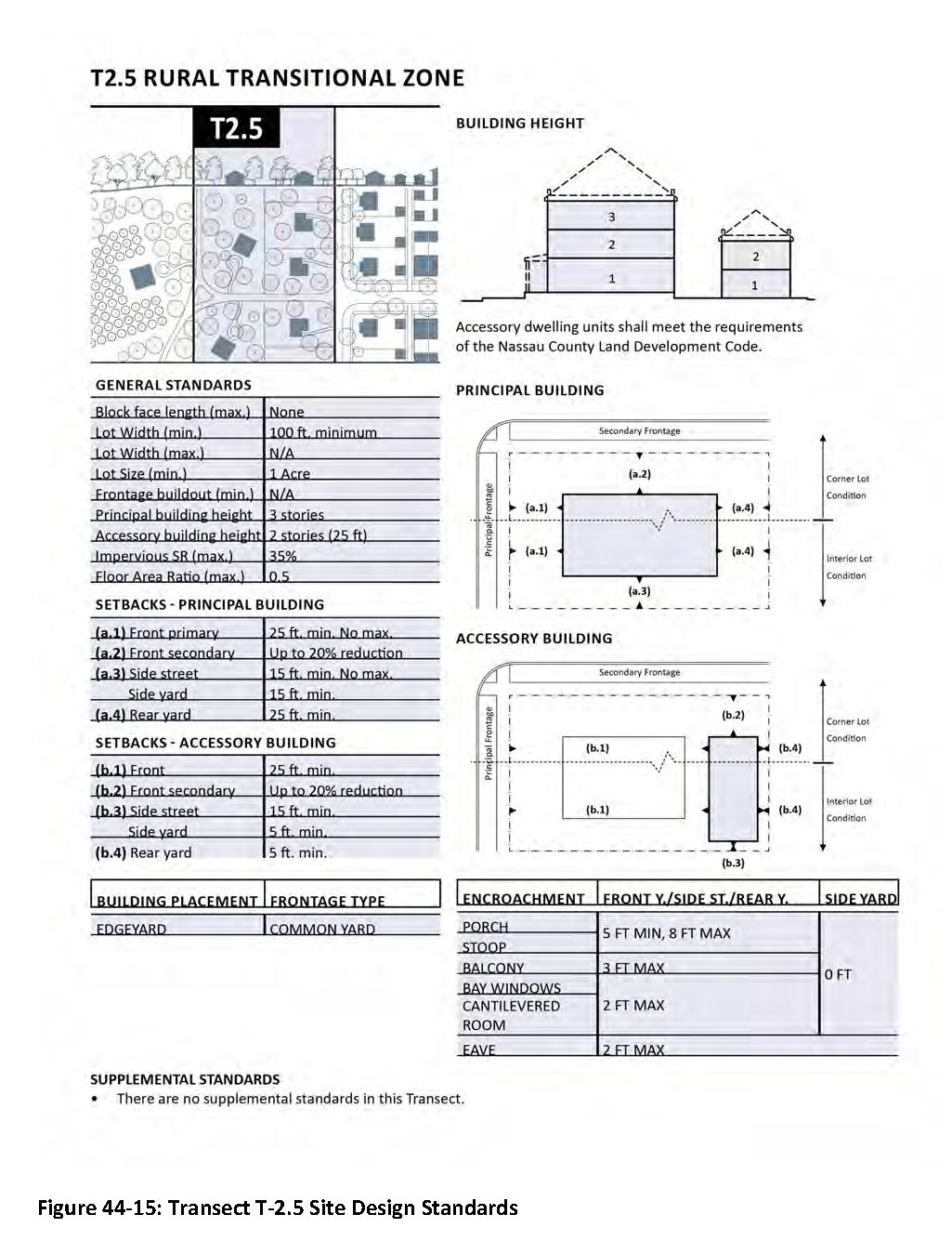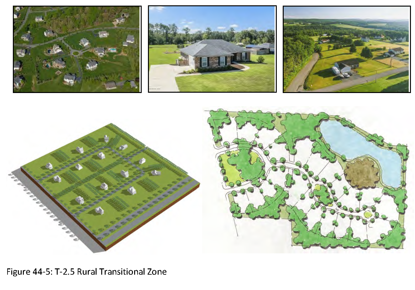 T-2.5 Rural Transitional Zone. This transect consists of low-density residential areas between the rural zones and suburban zone. Building sites in these zones are generally one (1) to five (5) acres. Typical land use is for single family detached homes. Planting is naturalistic and setbacks are relatively deep. Building height is up to three (3) stories. This transect is intended to provide a transition area around the T-2 rural zone. Such transition from rural to suburban maintains T-1.5 to T-2 lands rural and prevents encroachment of the T-3 suburban zone into rural areas.