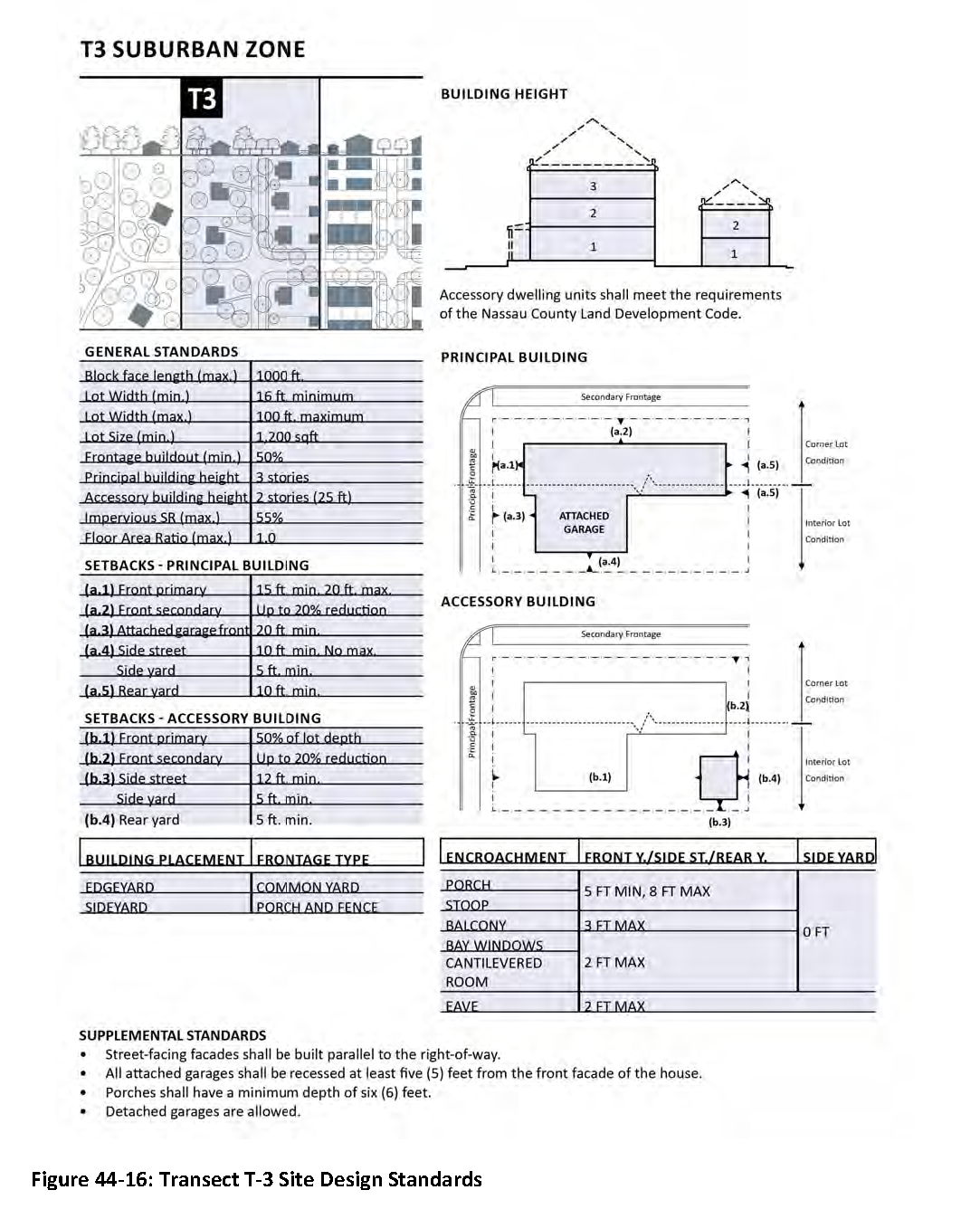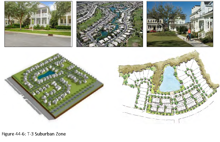 T-3 Suburban Zone. This transect consists of low-density residential areas with a density range of two (2) to five (5) dwelling units per acre, adjacent to the urban transitional zone. Limited non-residential uses as permitted in section 44.05 may be allowed. Planting is generally uniform, and setbacks are relatively shallow. Blocks may be medium in length, and the roads irregular to accommodate natural conditions. Refer to Table 44-3: Transect Standards, for details on block size. Housing types are typically single-family detached homes and single-family attached homes. Building height is up to three (3) stories. The use of clustering and other similar techniques are encouraged to create a more compact, walkable and sustainable suburban development pattern.