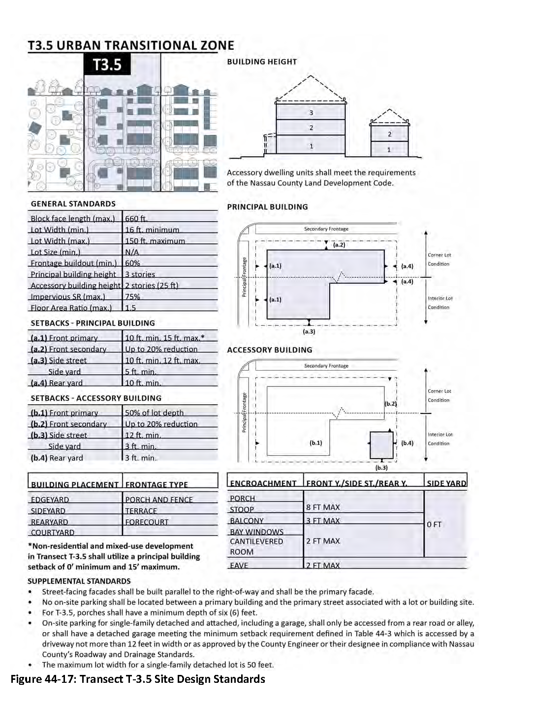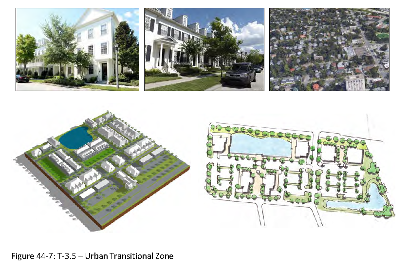 T-3.5 Urban Transitional Zone. This transect consists of medium-density residential areas ranging from five (5) to ten (10) dwelling units per acre, and a mixture of uses, adjacent to the urban edge. Blocks are generally medium sized to allow for a mixture of residential single-family attached and limited detached product and multi-family. Refer to Table 44-3: Transect Standards, for details on block size. Neighborhood commercial is permitted at fringe of T-4 and in clustered interior locations. Building height is up to three stories. Development in this transect shall be compact and walkable with retail, service, and civic uses necessary to support the day-to-day life of residents without the predominant use of the automobile. Such uses shall be located in central neighborhood clusters or adjacent to T-4 urban edge/urban general zone. In transect 3.5, nonresidential services may be provided from adjacent transects when contiguous to transect 4, 4.5, or 5. Nonresidential services are encouraged within Transect T-3.5 when fronting on US 17 or SR 200 to support walkable, mixed-use neighborhood environments. However, T-3.5 may consist of exclusively residential uses when nonresidential services are readily available in adjacent or nearby transects.