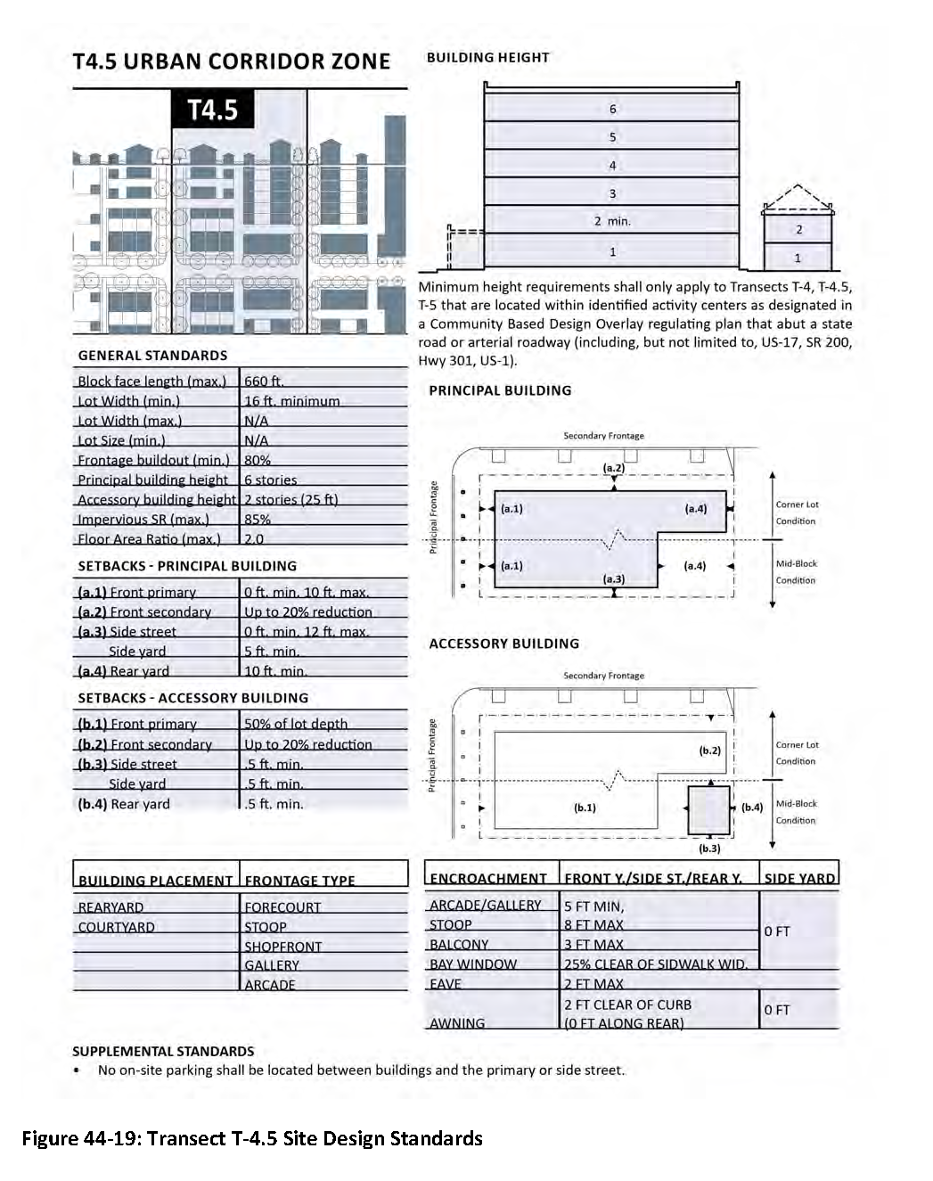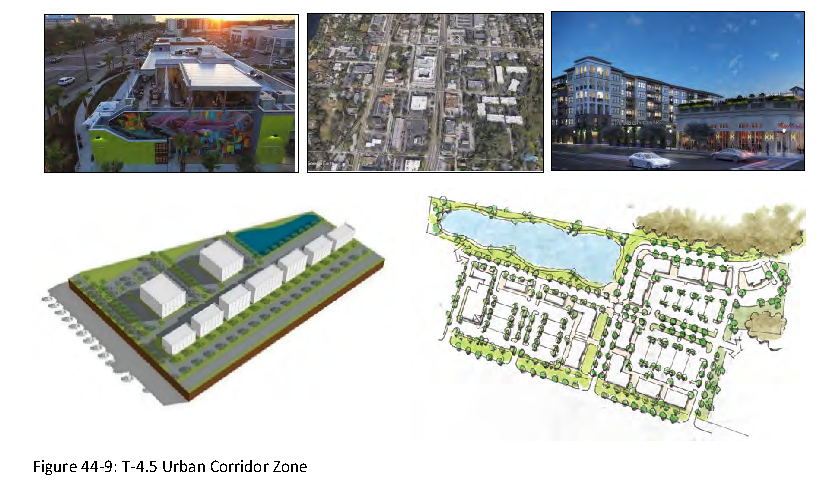 T-4.5 Urban Corridor Zone. This transect consists of a mix of uses but can be primarily non-residential or multi-family. While generally arranged to accommodate vehicular traffic, application of high-quality urban form and walkability is integral, as this transect serves as the connective tissue between individual urban nodes. The residential density varies from zero (0) to eighteen (18) dwelling units per acre. This transect has a wide range of building types. Streets with barrier curbs and sidewalks define medium-sized to large blocks. Refer to Table 44-3: Transect Standards, for details on block size. Buildings are located to define the street edge. Building heights can reach up to six (6) stories and shall define the street edge. The first floor of all buildings engages the public realm by promoting active and walkable streets.