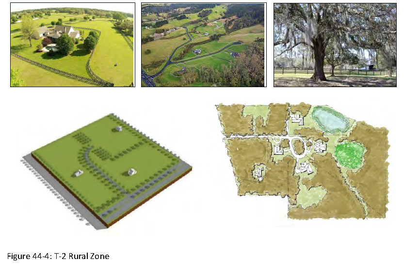 T-2 Rural Zone. This transect consists of sparsely settled lands in an open or cultivated state. Typical structures are single family detached homes and agricultural buildings. Planting is generally naturalistic and setbacks are relatively deep. Typical land uses include agricultural uses and single-family ranchettes ranging in five (5) to twenty (20) acres in size. Building height is up to three (3) stories. Cluster subdivisions and other techniques are encouraged to preserve the rural aesthetic and preserve a rural way of life. It is the intent to differentiate the T-2 rural zone from the T-2.5 rural transitional zone and T-3 suburban zone through the transect specific design standards established in Section 44.06.