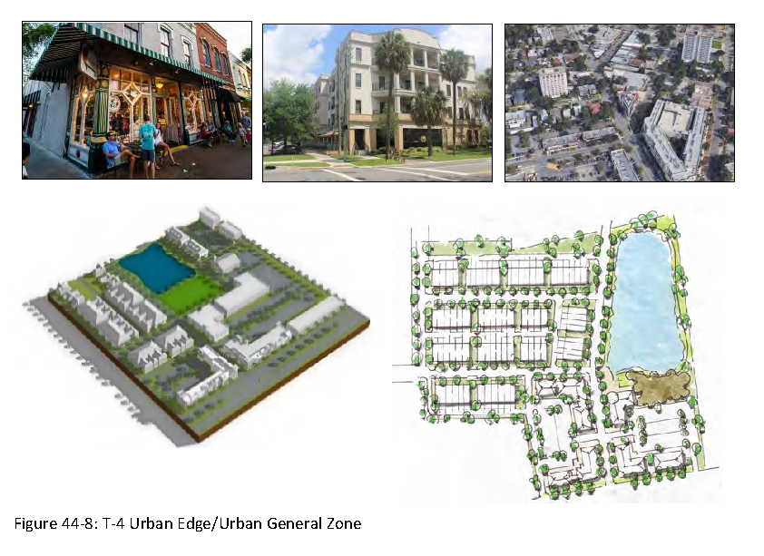 T-4 Urban Edge/Urban General Zone. This transect is intended to be a compact mixed-use zone arranged, primarily, as residential urban fabric. Density is eight (8) to fifteen (15) dwelling units per acre. This transect shall have a wide range of building types and a mixture of uses is required. Setbacks and landscaping are variable. Streets with curbs and sidewalks define medium-sized blocks. Refer to Table 44-3: Transect Standards, for details on block size. Building height is up to four (4) stories. This transect creates compact mixed use village centers surrounded by or within walking distance of compact residential neighborhoods. The development pattern and program shall be as such to support the intent. This is not a primarily residential zone.
