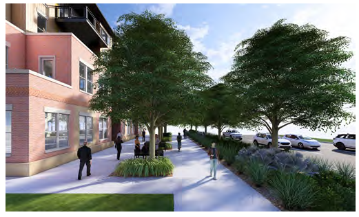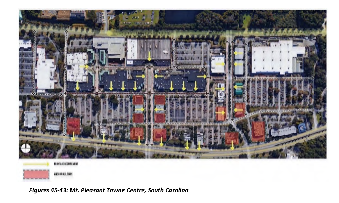 Anchor buildings may be used to facilitate building frontage requirements defined by the transect during incremental development. As an example, the north block face length fronting a main street may require ninety (90) percent building frontage in transect 5. Provided there are two (2) anchor buildings at the corners of the defined block on the north block face, screened parking may be permitted. Parking shall not be located in the space between the anchor buildings, which is designated for future outparcels. These outparcel areas must be clearly identified on the site plan and reserved for phased development, ensuring cohesive site integration as the area builds out.