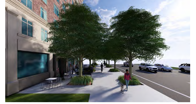 Anchor buildings shall be designed to engage pedestrians and create visual interest along the streetscape. The ground floor shall create an active pedestrian realm through uses such as retail, cafes, or similar storefronts. Emphasis shall be placed on promoting street level interaction through the use of large windows, transparent facades, and public entrances. The architectural design of the anchor building should reflect the character and styles of the surrounding area while maintaining consistency with the urban aesthetic.