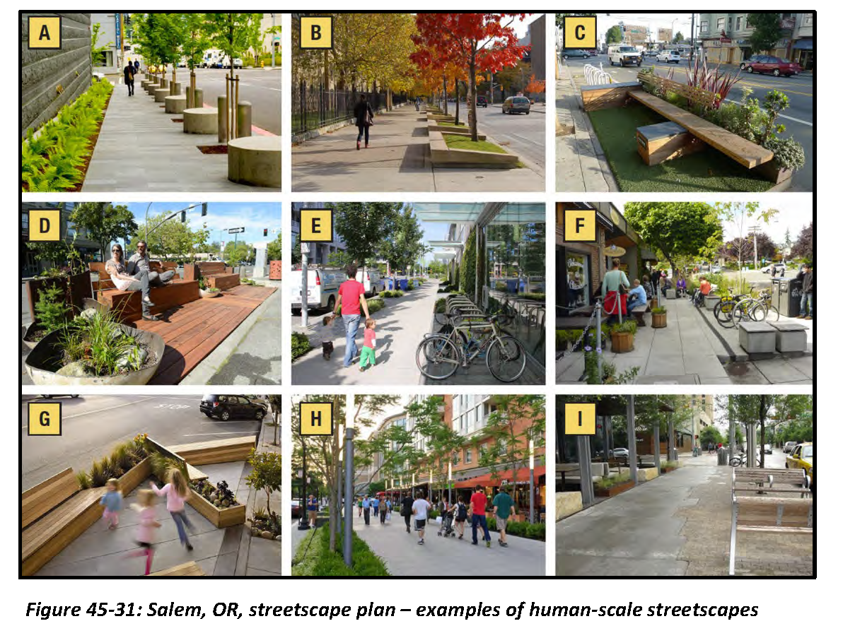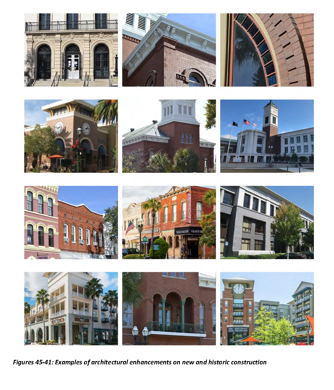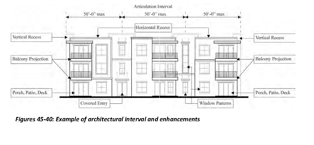 Architectural enhancements. Facade articulation shall be required to add architectural interest and variety to the massing of a building to prevent monotonous facades. A variety of features shall be incorporated into the design of the buildings to provide sufficient articulation of the facades. This shall be achieved by incorporating the use of vertical or horizontal reveals, stepbacks, modulation, projections, roof detailing, and three-dimensional details between surface planes to create shadow lines and break up flat surface areas. The "articulation interval" at which the repetitive architectural enhancements repeat should not be greater than fifty (50) feet in length measured horizontally as shown in Figure 45-40. This interval may be adjusted by the planning director as needed to comply with additional design standards. A minimum of four (4) of the following architectural enhancements or other similar treatments shall be integrated into building facades which front sidewalks and streets: