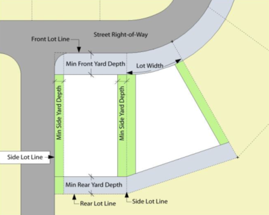 The front yard requirement also applies to the yard between the building and the side street, in the case of a corner lot. This front yard requirement is to be measured from the right-of-way line to the building at the closest point.