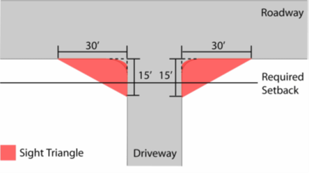 Wherever a driveway intersects with a local, collector, or arterial street, unobstructed cross-visibility shall be provided between the heights of three and seven feet above the grade elevation of the roadway within sight triangles at each side of the intersecting driveway. Each sight triangle shall be measured from a point where the curb or edge-of-pavement line for the roadway and the extended edge of the driveway meet, to a point along the driveway edge located fifteen (15) feet behind the roadway's curb or edge-of-pavement line, to a point along the roadway curb or edge-of-pavement line located thirty (30) feet from the original point. See Figure 12.1.4(a).