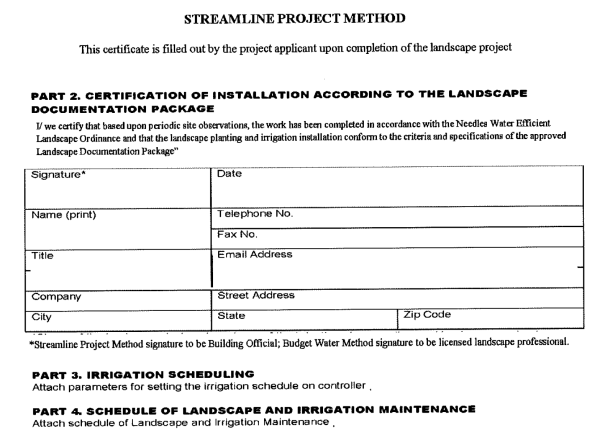 Project area must be less than 2500 square feet to qualify. Requirements will be minimal and less costly then utilization of the “Water Budget Method”, as described in Section 99.11.06 Requirements of the Streamlined Landscape Method include utilization of plants included in the “Needles Approved Water Efficient Plant list”, Exhibit “A”, as well as plants identified in the reference book “Landscape Plants for the Arizona Desert – Guide to Growing More than 200 Low-Water-Use Plants”, as well as the reference guide “Low Water-Use Plants for California and the Southwest” by Carol Shuler; installation of turf is prohibited. These projects are exempt from the requirement of having a State of California professional authorized to design a landscape or an irrigation system sign-off; as well as lower permit fees.