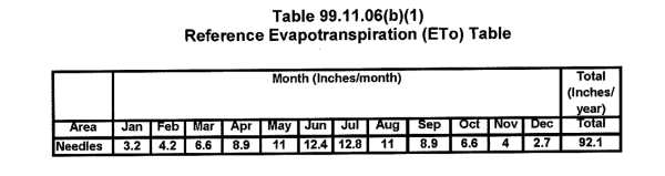 “Reference evapotranspiration” or “ETo” means a standard measurement of environmental parameters which affect the water use of plants. ETo is expressed in inches per day, month, or year as represented in Table 99.11.030.01, and is an estimate of the evapotranspiration is used as the basis of determining the Maximum Applied Water Allowance so that regional differences in climate can be accommodated.