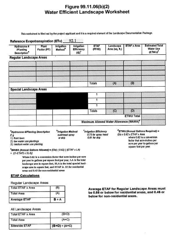 MAWA=(ETo-Eppt) (0.62) [(0.55 x LA) + (0.45 x SLA)] for residential areas, MAWA=(ETo-Eppt)(0.62)[(0.45 x LA) + (0.55 x SLA)] for non-residential areas.
