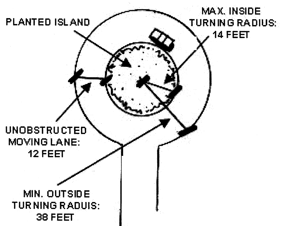 Cul-de-sacs shall have an unobstructed twelve-foot-wide moving lane with a minimum outside turning radius of thirty-eight (38) feet. Upon a favorable determination by the city manager or designee, lands inscribed within a maximum inside turning radius of fourteen (14) feet may be retained as planted open space; in this case, the planted area shall be delineated with raised concrete curbing and shall provide for clear visibility between two (2) feet and eight (8) above the adjacent roadway centerline grade (see Figure 27-476-1).