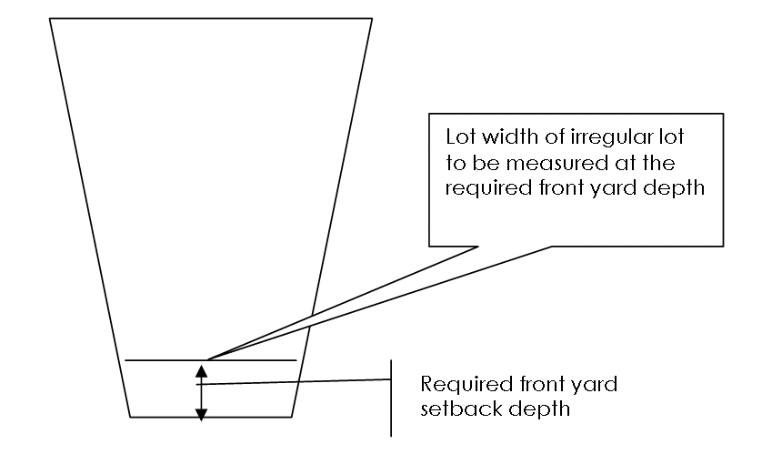 In the case of irregularly shaped lots and lots existing and/or proposed to front a street or end of a street, the minimum width requirements as specified in this title shall be measured at the front yard setback depth for the lot (see diagram), provided that in no case shall the lot width at the street line be reduced to less than fifty (50) percent of the minimum width requirement nor less than twenty-five (25) feet, whichever is greater.