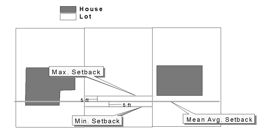 Building Setback Line. If the block frontage between two intersecting streets is improved with buildings on more than fifty (50) percent of the buildable lots on the block frontage, and new construction is proposed on a lot between two adjacent existing buildings on this block front, the building setback of the new construction shall not deviate more than five feet from the mean average setback line of the two adjoining improved lots and at least fifty (50) percent of the front façade shall be within five feet of the mean average setback line.