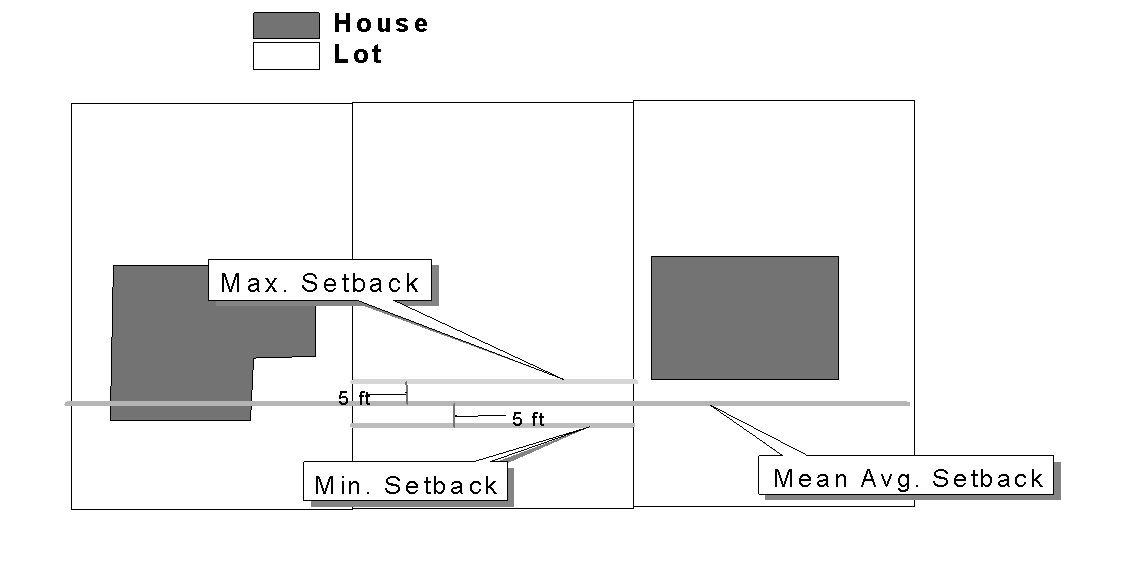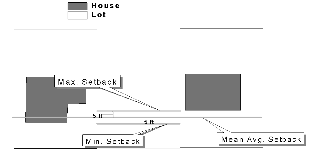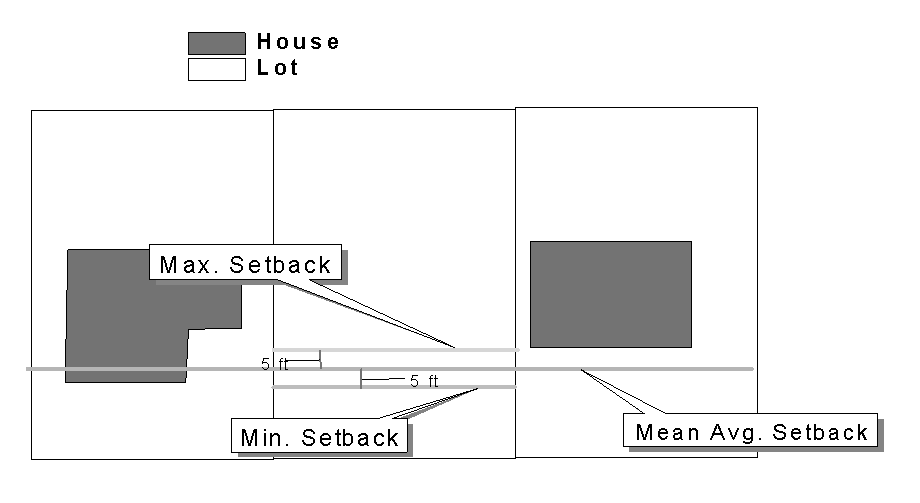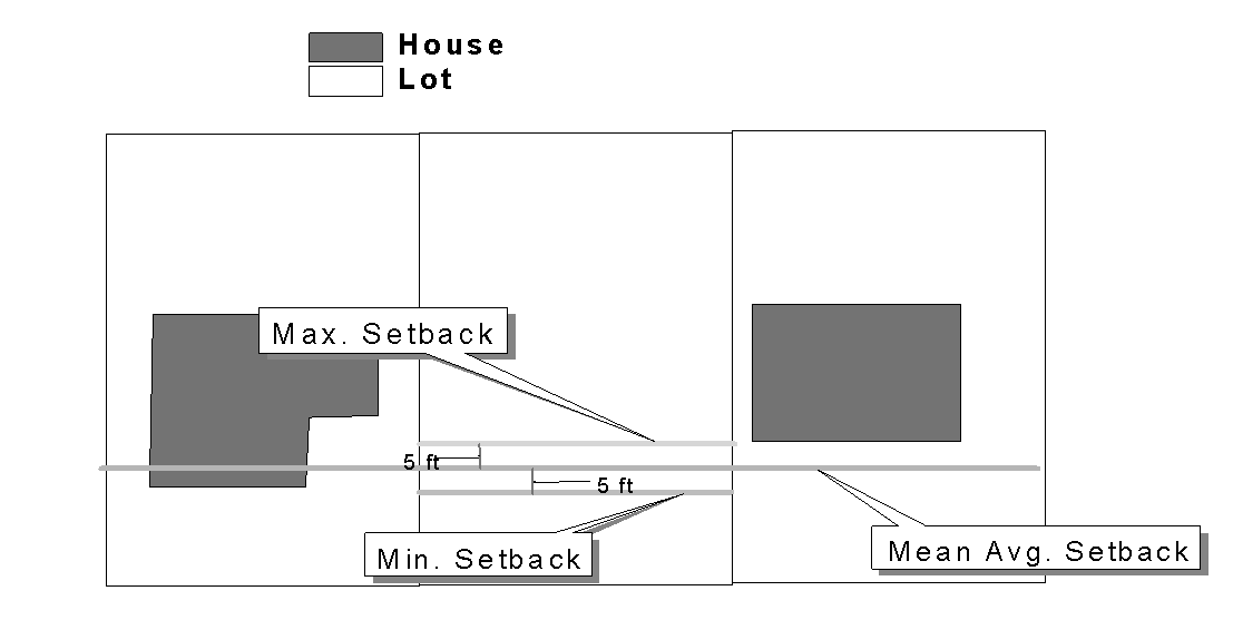 If the block frontage between two intersecting streets is improved with buildings on more than fifty (50) percent of the buildable lots on the block frontage, and new construction is proposed on a lot between two adjacent existing buildings on this block front, the building setback of the new construction shall not deviate more than five feet from the mean average setback line of the two adjoining improved lots and at least fifty (50) percent of the front façade shall be within five feet of the mean average setback line.