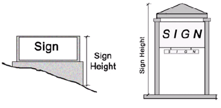 Sign Height. The height of a sign shall be measured as the vertical distance from the uppermost point used in measuring the area of the sign to the lowest elevation of the existing grade immediately below and adjoining the sign