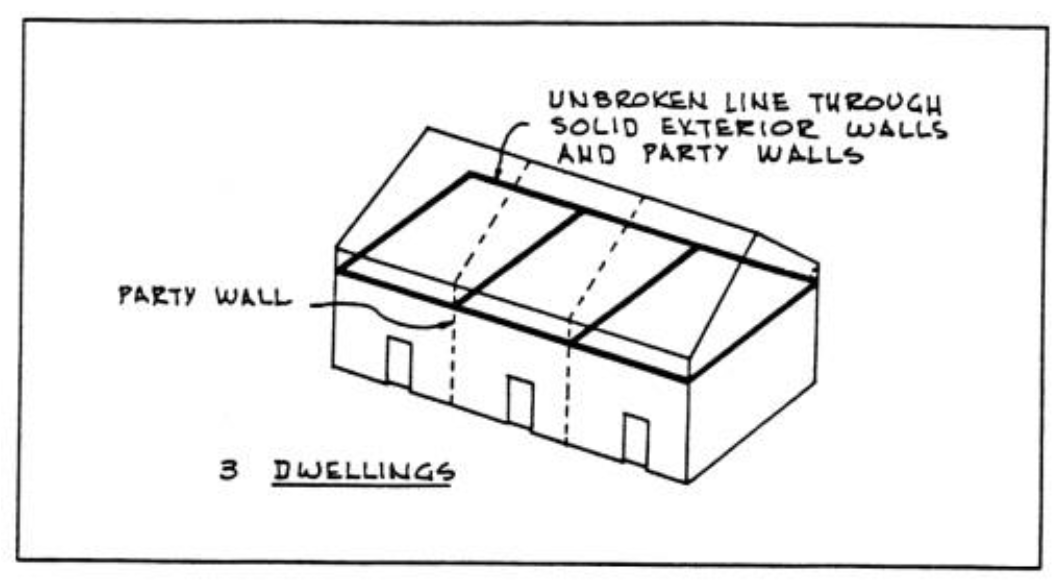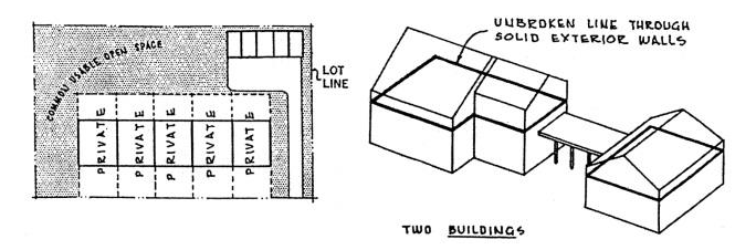 The connection of two buildings by means of an open porch, breezeway, passageway, carport or other such open structure, with or without a roof, shall not be deemed to make them one building. A building may occupy more than one lot, but in the case of a series of two or more attached and/or semi-detached dwellings, the building which such dwellings comprise shall be considered to occupy a single lot, regardless of ownership, for purposes of determining lot area, average lot width, lot area per dwelling unit, floor area ratio, the number of parking spaces and other pertinent requirements, if the resulting parking spaces are usable open space are and will continue to be available in the same proportion to all occupants of the building or buildings on the lot; otherwise, each such dwelling shall be considered to occupy a separate lot.