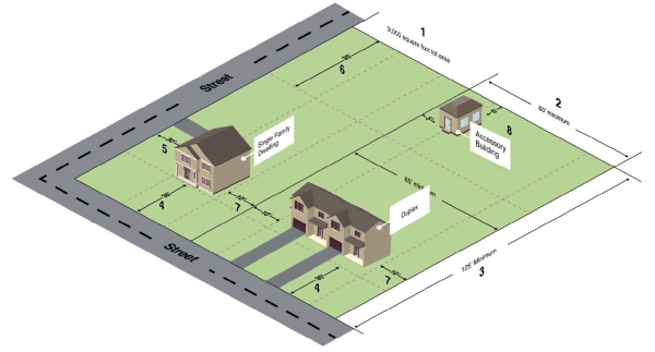 | Single Family Detached Dwelling | Single Family Detached Dwelling Front Corner Lot | Single Family Detached Dwelling Rear Corner Lot | Duplex | Accessory Uses | Other Uses | |