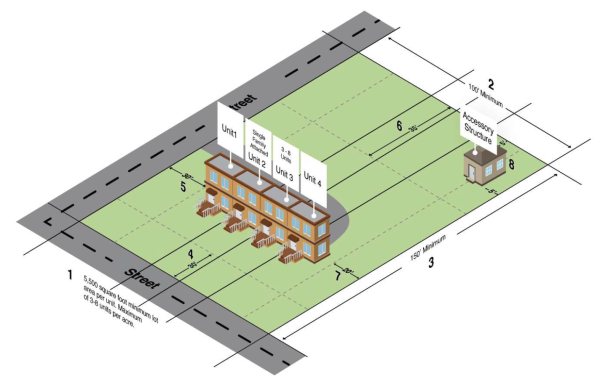 | Minimum Lot Area | 8,250 sq. ft. | 4,000 sq. ft. | 4,000 sq. ft. | – | 20,000 sq. ft. |