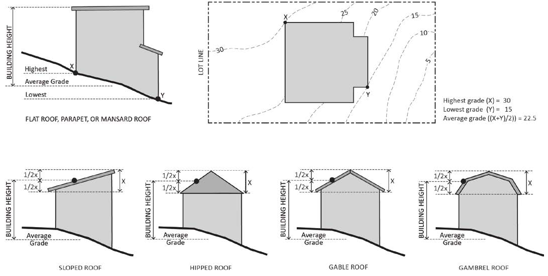 Measuring Building Height. Building height is measured from the average level of the highest and lowest points where the vertical plane of the exterior walls touch existing or finished grade, whichever is lower, to the highest point on the roof, the top of the parapet wall, the wall coping of a flat roof, or the deck line of a mansard roof except as provided below.