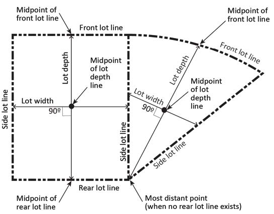 Lot Depth. Lot depth is measured along a straight line drawn from the midpoint of the front property line of the lot to the midpoint of the rear property line or to the most distant point on any other lot line where there is no rear lot line.