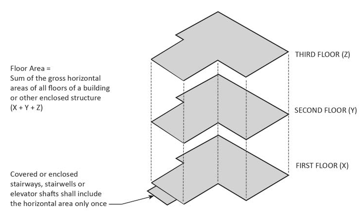 Determining Floor Area. The floor area of a building is the sum of the gross horizontal areas of all floors of a building or other enclosed structure, measured from the outside perimeter of the exterior walls and/or the centerline of interior walls.