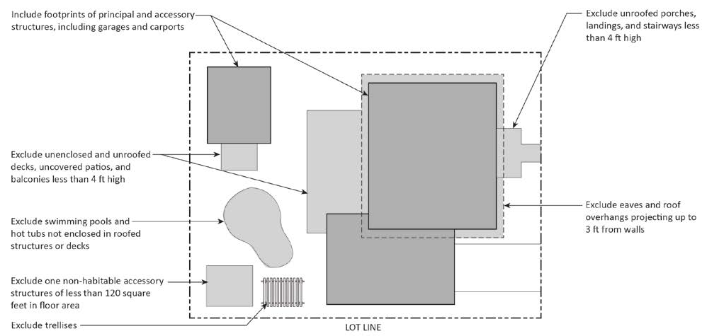 Determining Lot Coverage. Lot coverage is the ratio of the total footprint area of all structures on a lot to the net lot area, typically expressed as a percentage. The footprints of all principal and accessory structures, including garages, carports, covered patios, and roofed porches, shall be summed in order to calculate lot coverage. The following structures shall be excluded from the calculation: