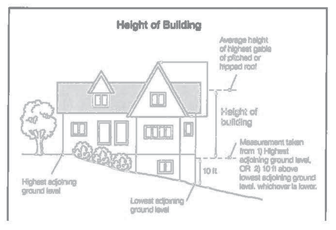 Height of building: The vertical distance between the highest adjoining ground level at the building or ten feet above the lowest adjoining ground level, whichever is lower, and the highest point of a flat roof, the deck line of a mansard roof, or average height between the eaves and the peak of the highest gable of a pitched or hipped roof.