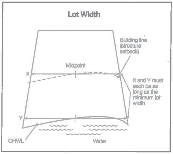 Building line: A line parallel to a lot line or the ordinary high-water level at the required setback beyond which a structure may not extend.